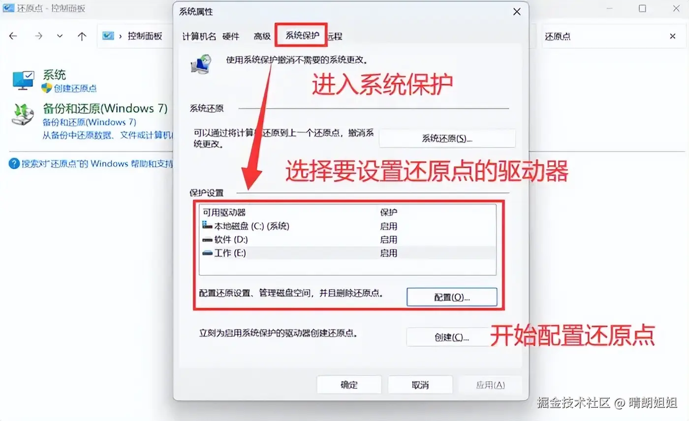 步骤:进入电脑控制面板,找到 【系统保护】 ,点击要创建还原点的驱动器,选择 【配置】 ,跟随指引创建还原点。需要恢复数据的时候,重新回到这个页面,点击 【系统还原】 。
