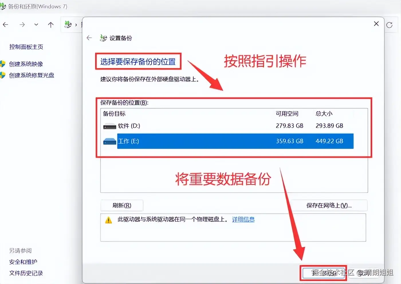步骤:在控制面板中,选择 【系统】>【备份和还原】 ,选择设置备份,并选择要备份数据要保存的磁盘,跟随指引操作即可。