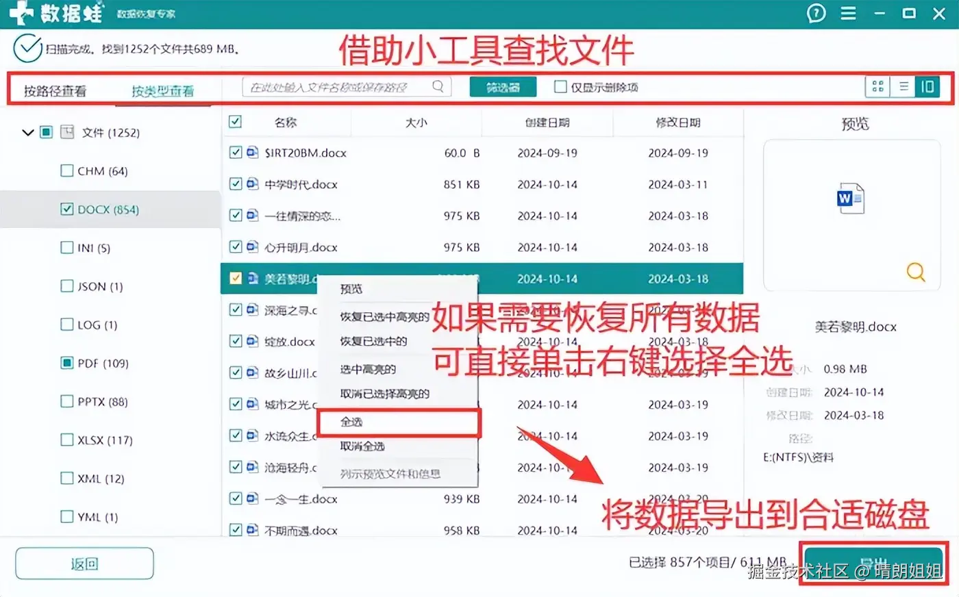 步骤2:扫描结束后,你将会得到一份列表,其中有多项数据。你可以借助列表上方的小工具,快速找到需要恢复的文件。如果是需要恢复所有的数据,也可以单击右键,选择 【全选】 ,然后点击 【导出】 ,恢复到指定位置。