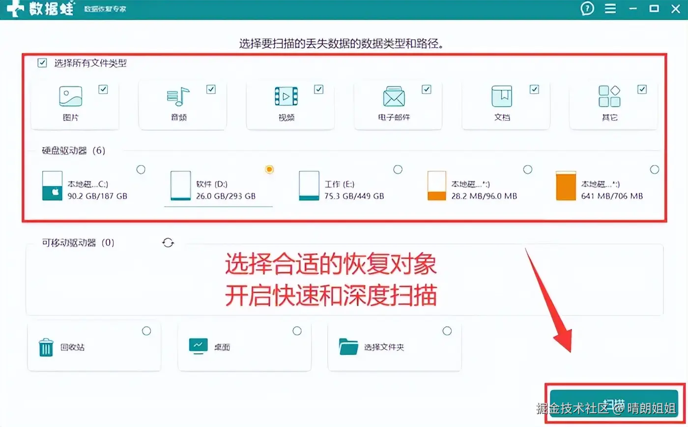 步骤1:在主页面中,选择你需要恢复的文件类型和驱动器,然后点击 【扫描】 。软件将自动搜索电脑中的数据,这个过程你需要等待一段时间。