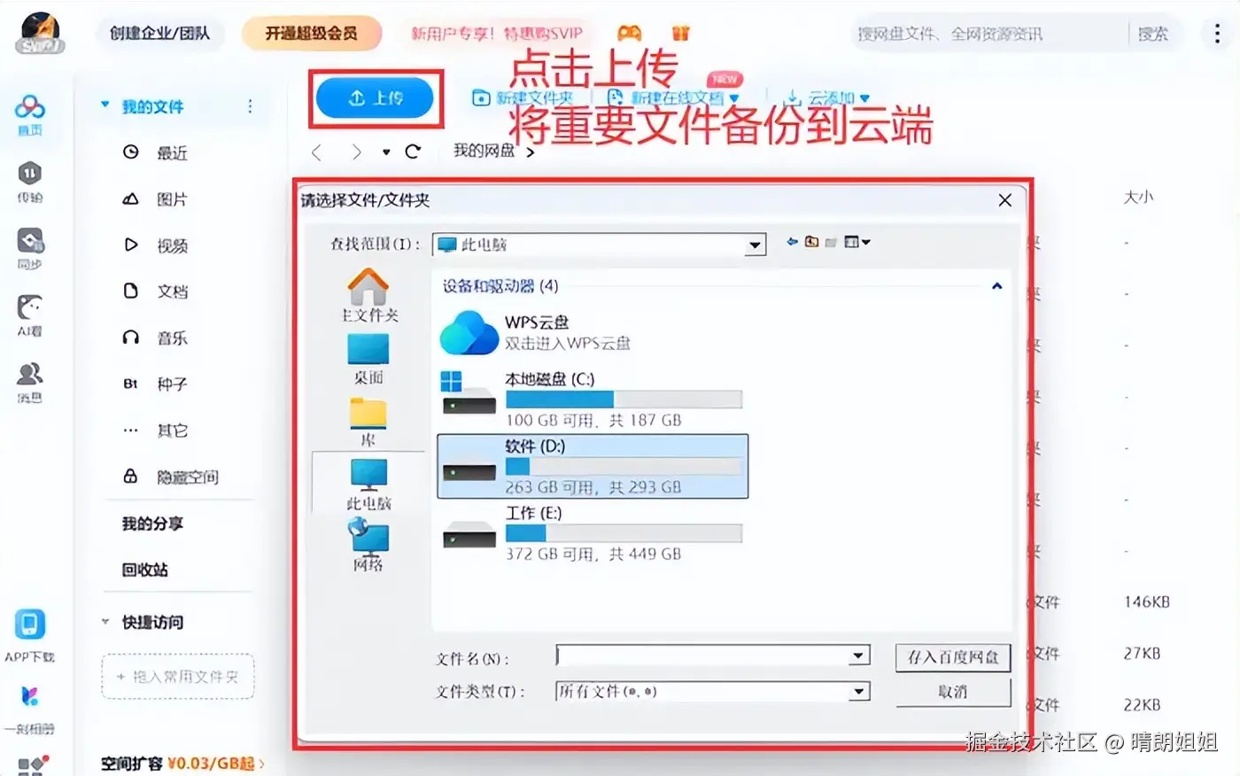 步骤:选择一个合适的云存储平台或工具,登录后,选择 【上传】 ,将重要资料传输到云端。