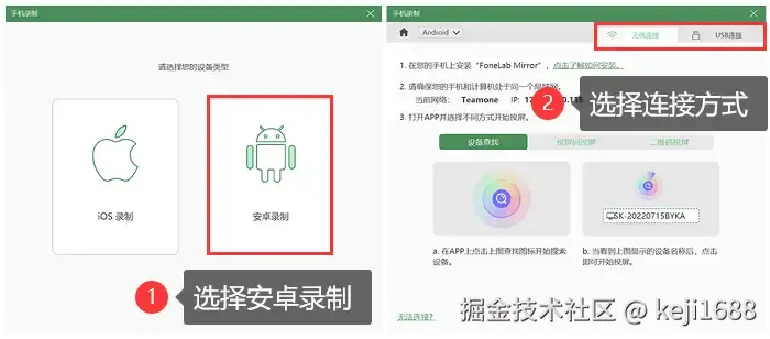 步骤2:根据手机系统,选择合适的设备类型,在此红米手机选择 【安卓录制】 ,然后通过无线连接或USB连接方式,将手机屏幕投屏到电脑上。