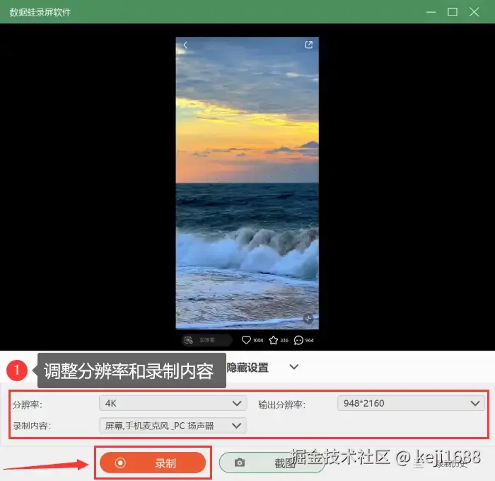 步骤3:在录制开始前,您可以自由调整录制参数,如分辨率、输出分辨率、录制内容等。手机怎么录屏?设置完成点击【录制】按钮即可进行手机录屏。