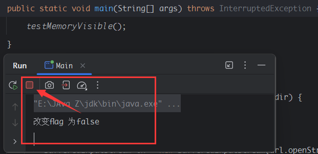```java public static boolean flag = true; public static void testMemoryVisible(){ Thread t1 = new Thread(new Runnable() {