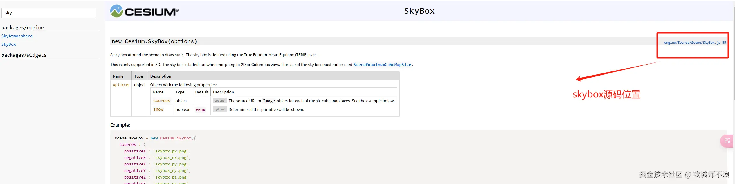Cesium的文档,搜到Skybox后可以直接点进去查看其源码,源码并不多,200来行,把源码搬出来,再来来看看我们要修改哪些地方。