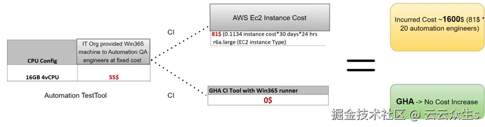 如果提供与其桌面镜像相同的虚拟机,自动化团队成员需要安装自动化工具。此云实例会产生固定费用。QA资源仅在工作时间使用此云实例,其余每天16个小时空闲。我们可以通过在空闲时间将这些虚拟机用作CI流水线运行器来显著减少AWS的使用,从而无需启动新的EC2实例。