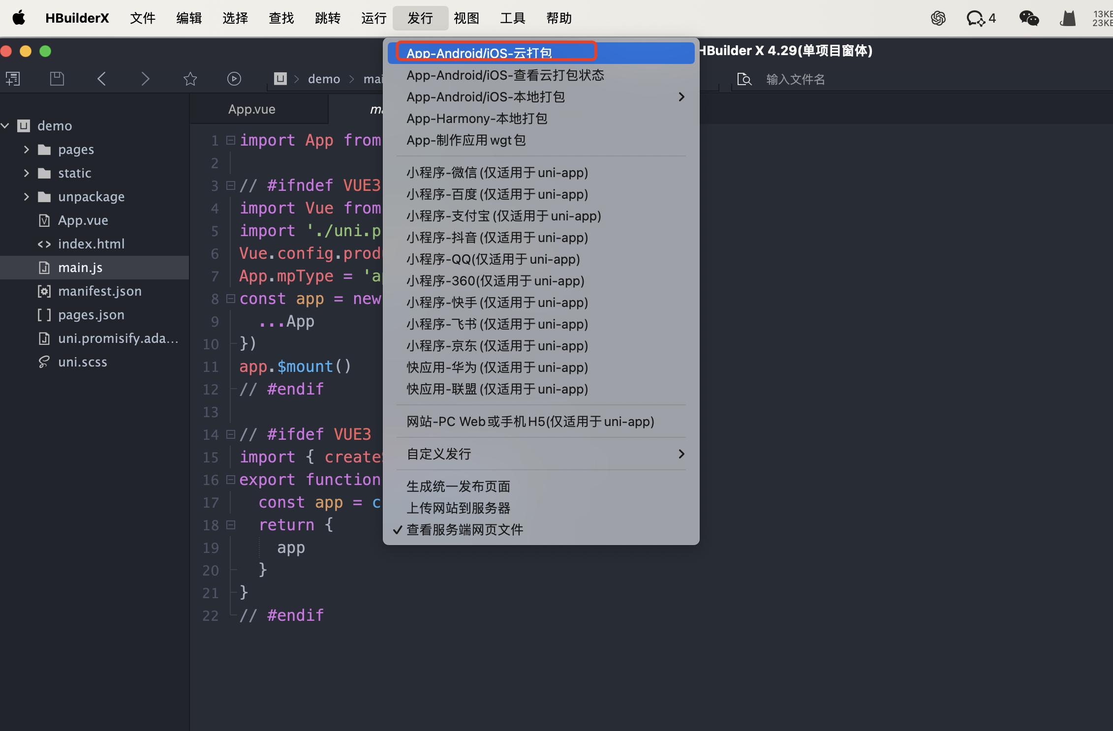 2、选择工具栏-->发行-->App-Andriod/IOS - 云打包