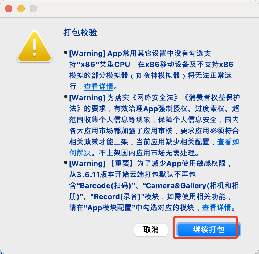 4、选择继续打包