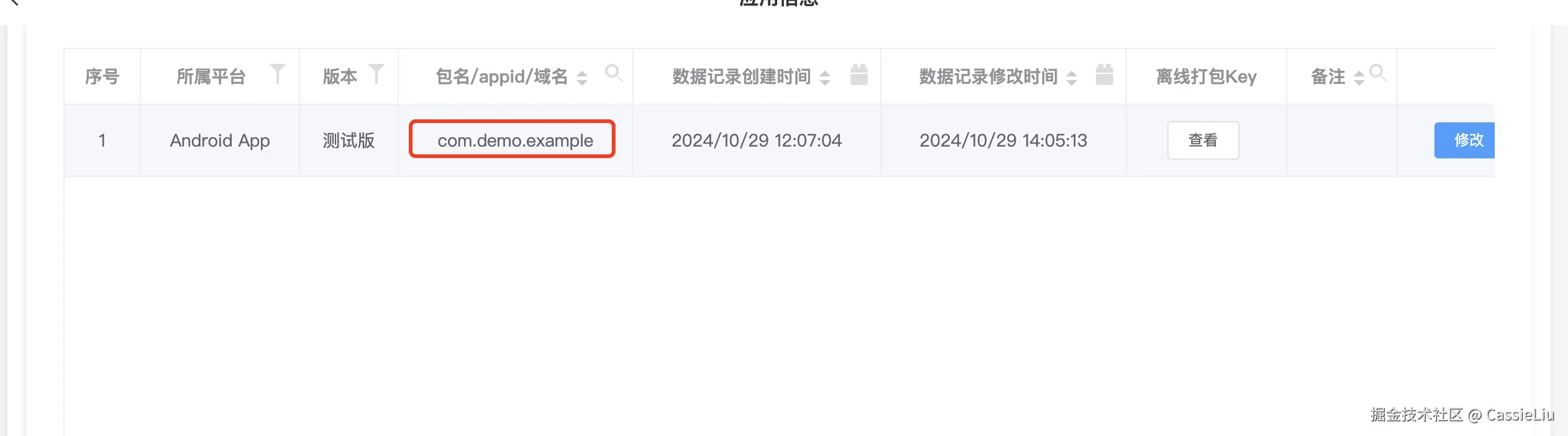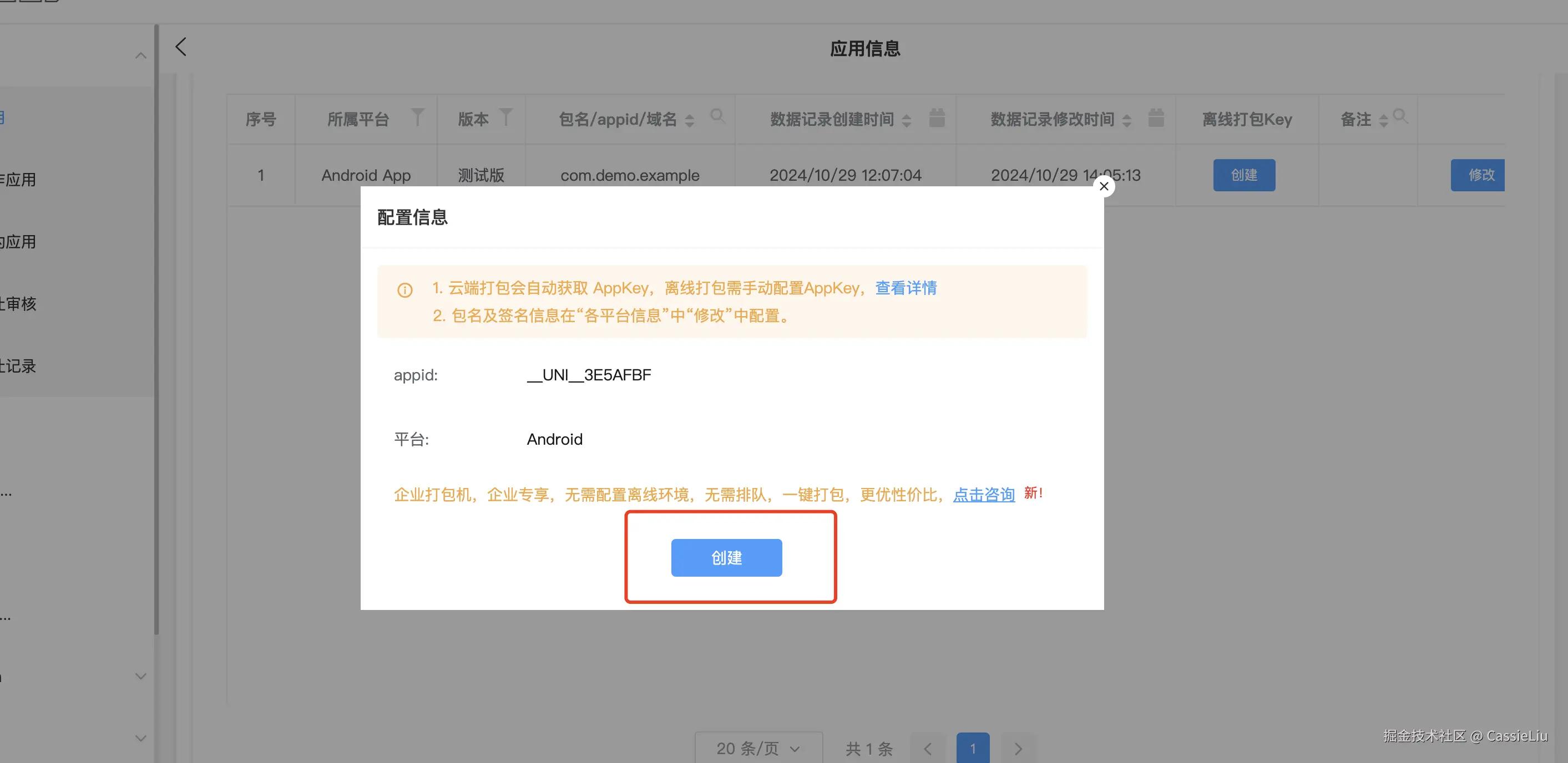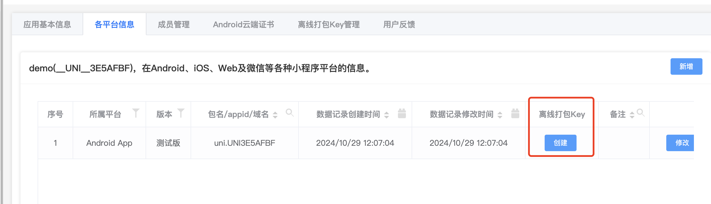 点击提交之后,返回到列表页面, 再 点击创建离线打包Key