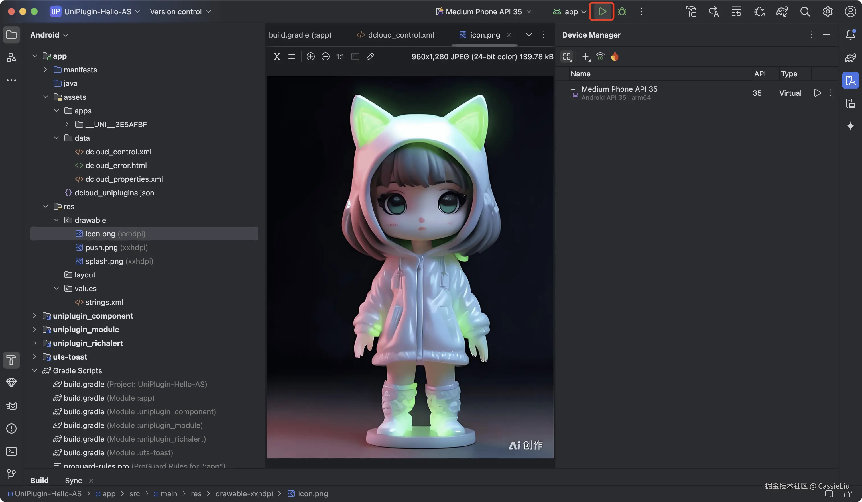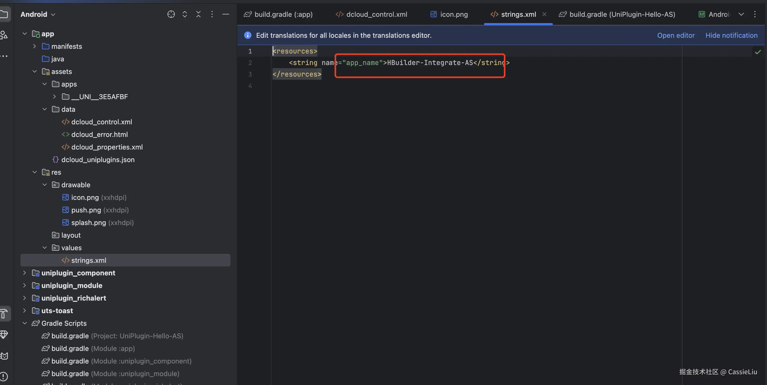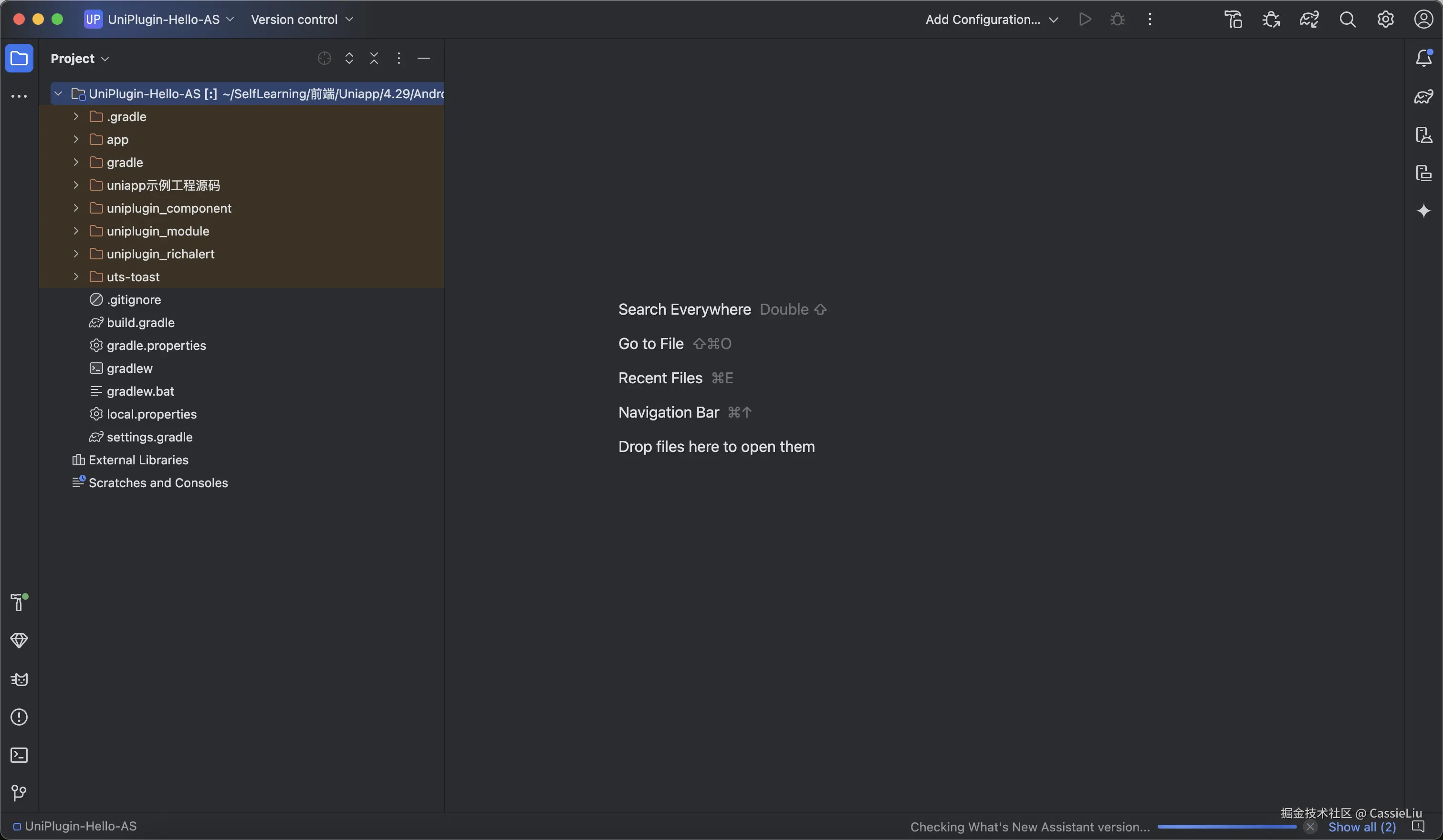 这里我们使用UniPlugin-Hello-AS 做一个demo, 将这个文件夹放到平时经常使用的workspace中, 打开Android Studio 编辑器: