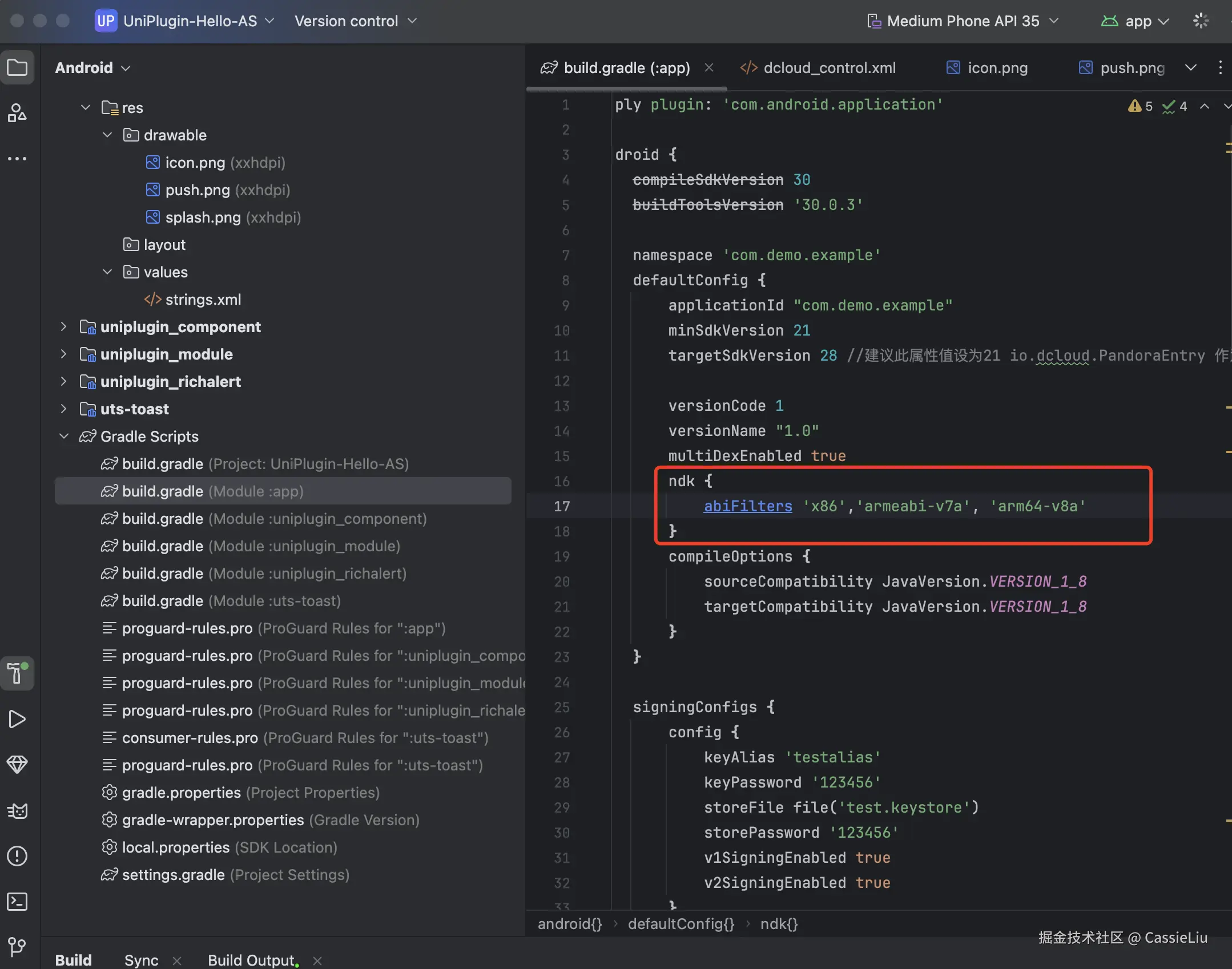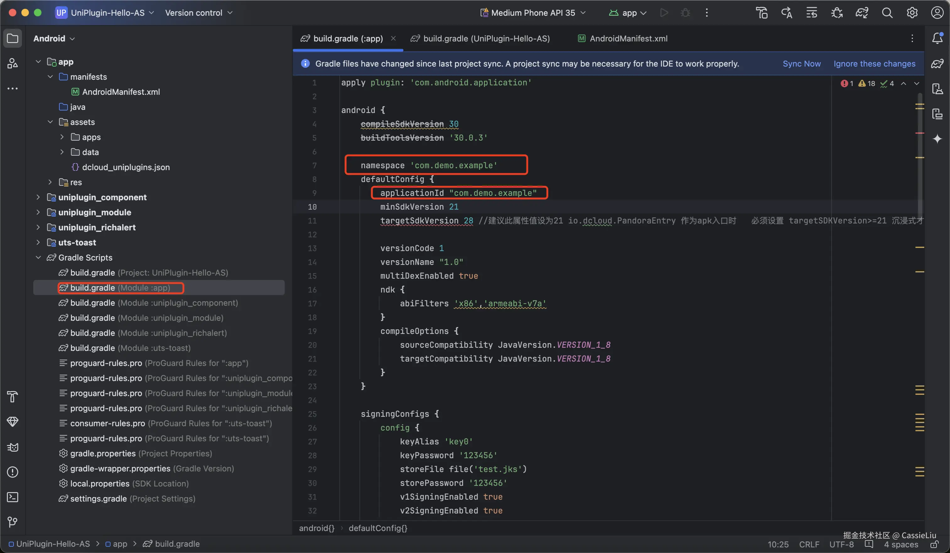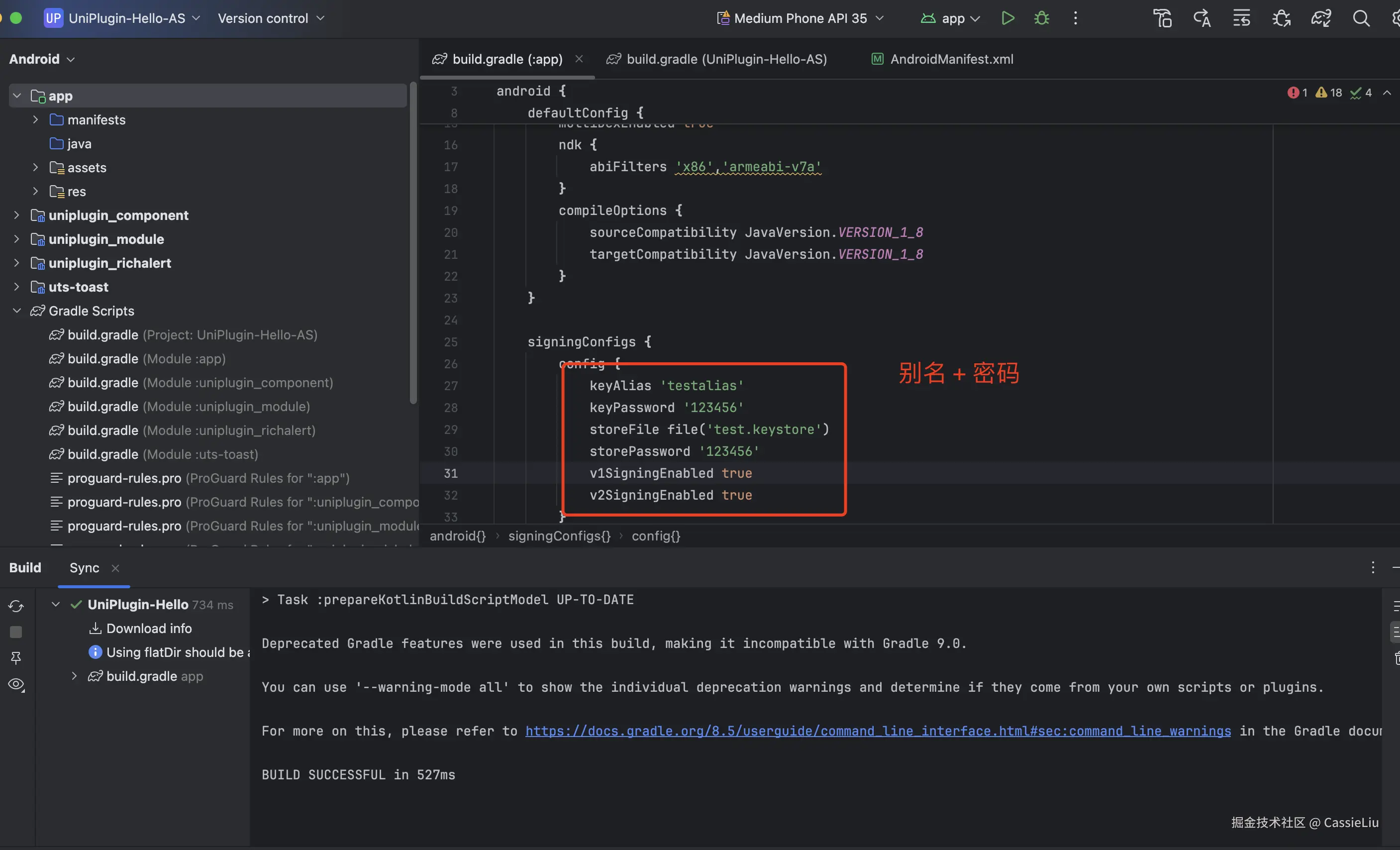 还是在build.gradle文件中找到signingConfigs 签名设置, 将之前的别名和密码填入, 然后点击文件上方的Sync now, 重新加载一下, 如果没有报错, 可进行下一步, 如果有报错, 说明文件别名和密码有不对的