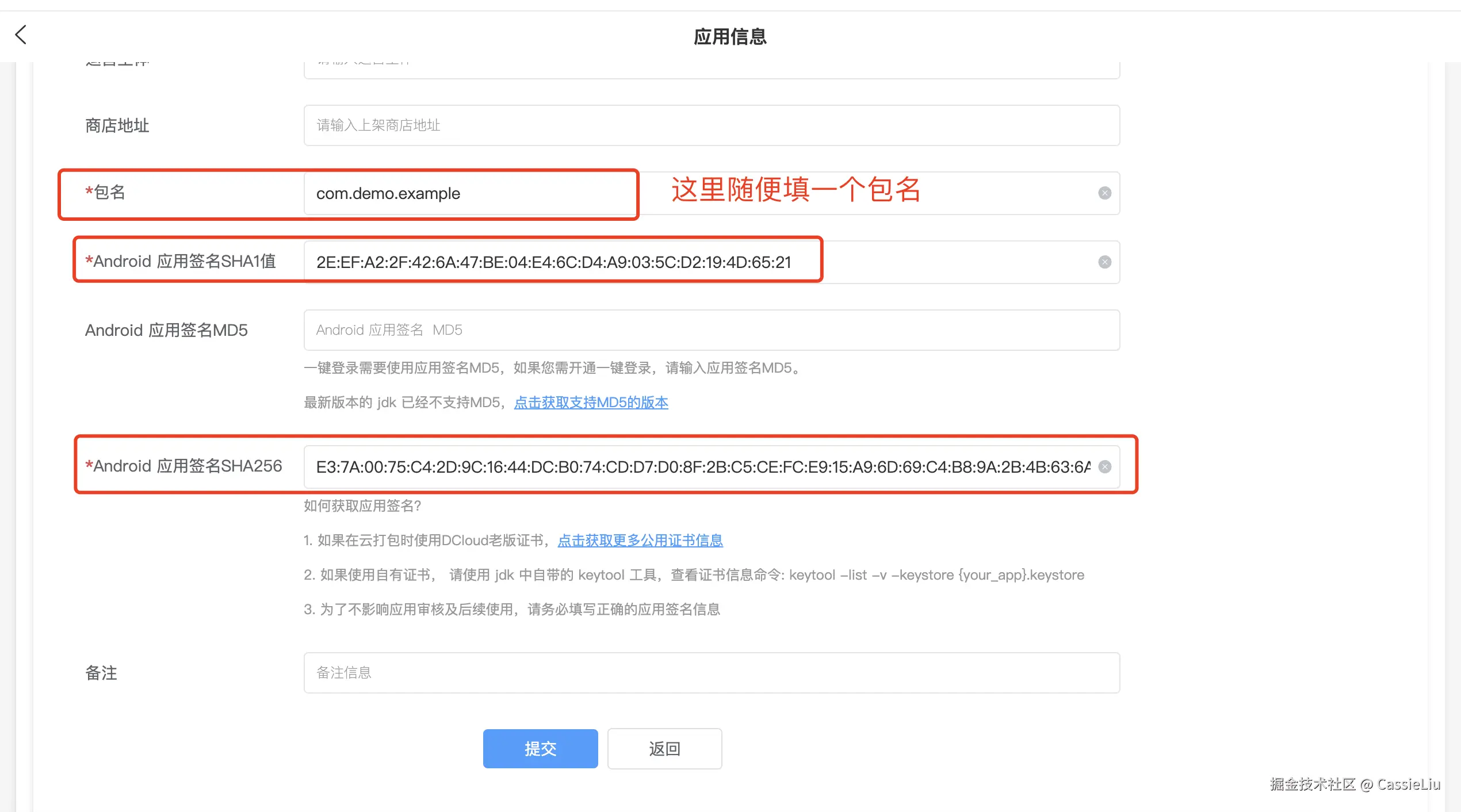 从上面的信息中, 我们可以看到,别名、SHA1、SHA256(记住这几个)需要用到, 我们依然打开开发者中心, 选择自己的应用:在各平台信息中, 将上面截图的信息填入进去: