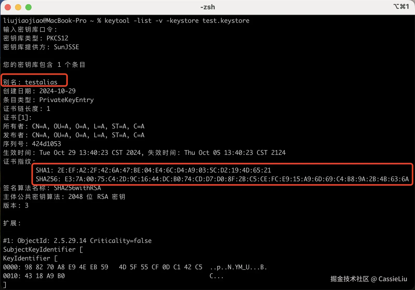 • alias testalias:为密钥条目指定一个别名(名称),这里是 testalias。别名用于在密钥库中标识特定的密钥或证书。