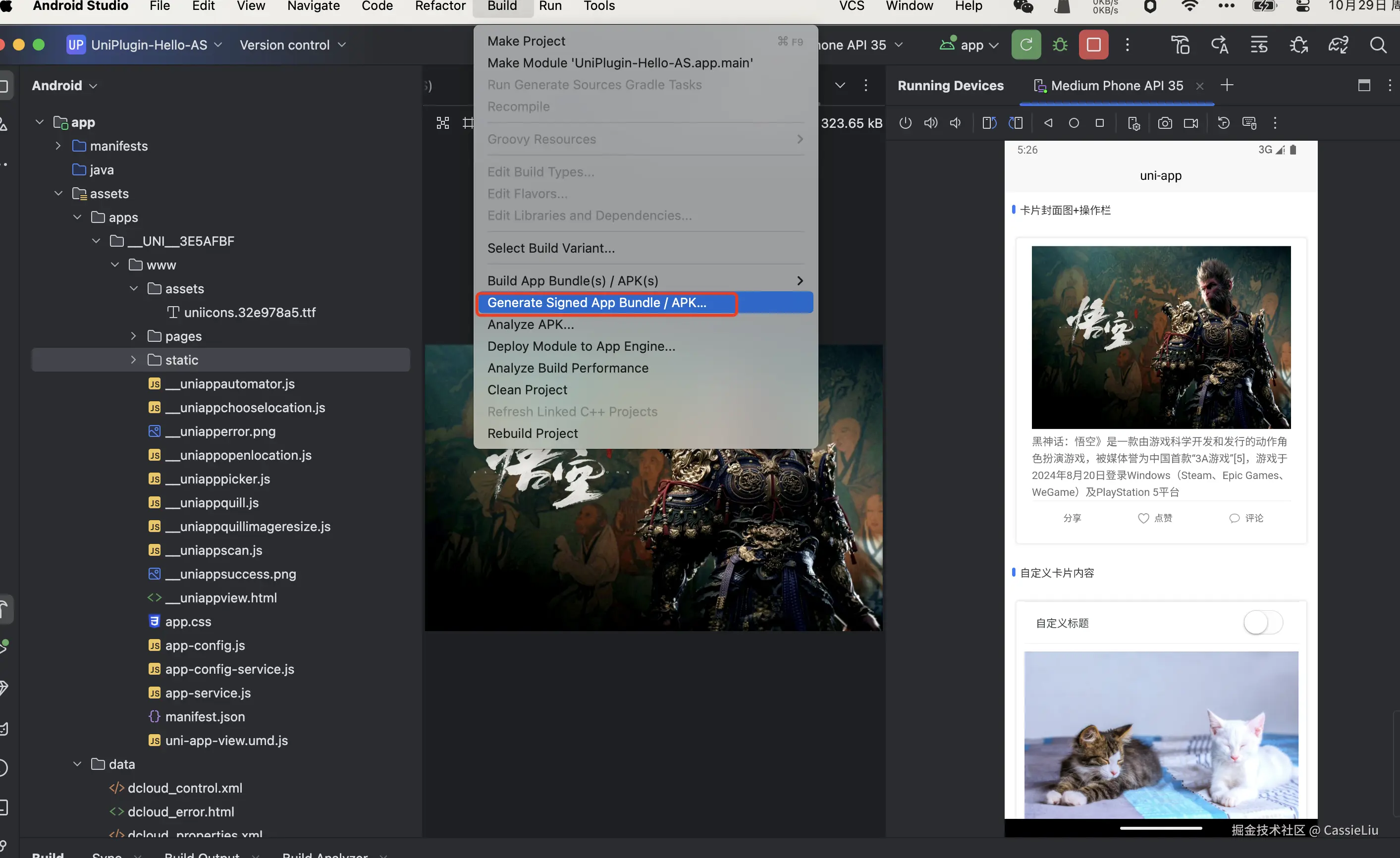 接下来就直接打包啦:点击工具栏中的Build –> Generate Signed App Bundle/APK