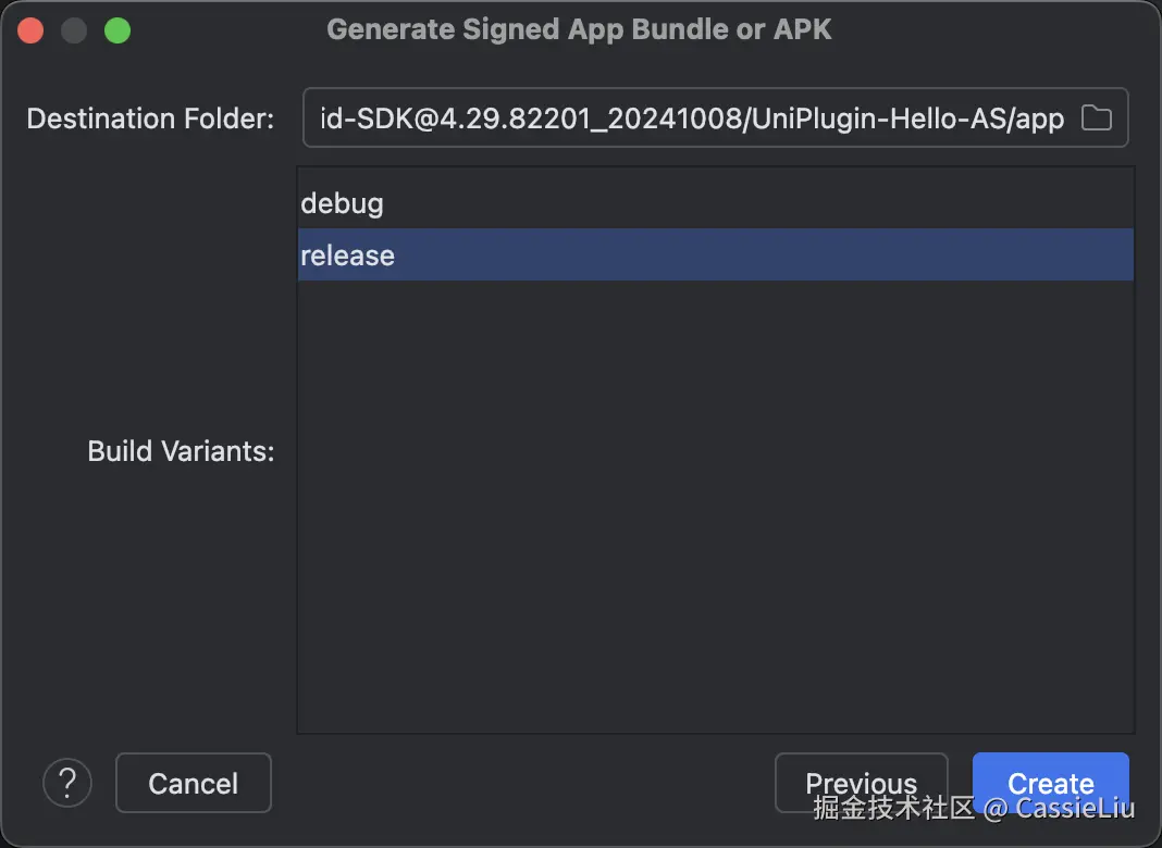 填完了之后点击 Next, 之后, 我们选择要打包的版本, 比如release, 点击Create