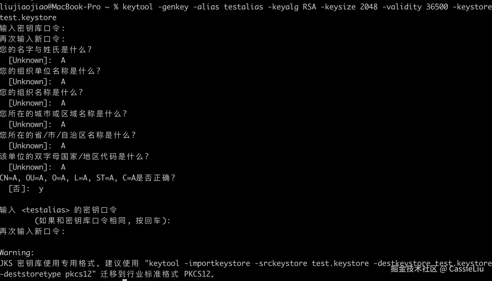 - keystore test.p12:将密钥库保存为 test.p12,扩展名通常为 .p12 或 .pfx,表示 PKCS12 格式