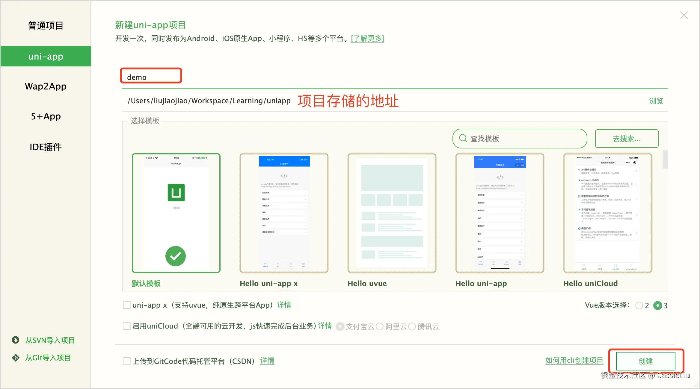 出现了新建uni-app项目, 填写项目名称并选择一个默认模板创建, 这里我以demo示例: