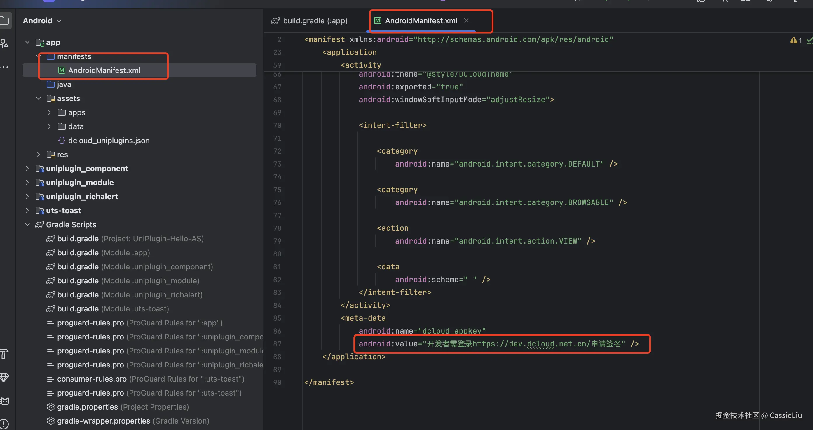 打开AndriodManifest.xml 文件, 找到对应标签, name为dcloud_appkey ,将自己的appKey填入到这里