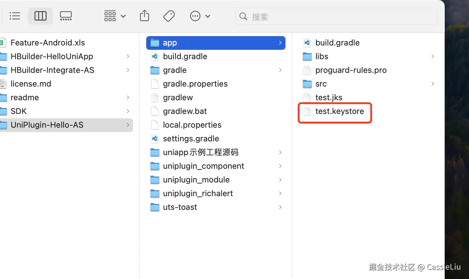 接下来将我们之前生成的证书放到这个项目里面来:(该文件就是生成之后, 在开发者中心的应用里面写入的SHA1 的这个文件, 我们生成的appkey 和这个文件是有关系的)