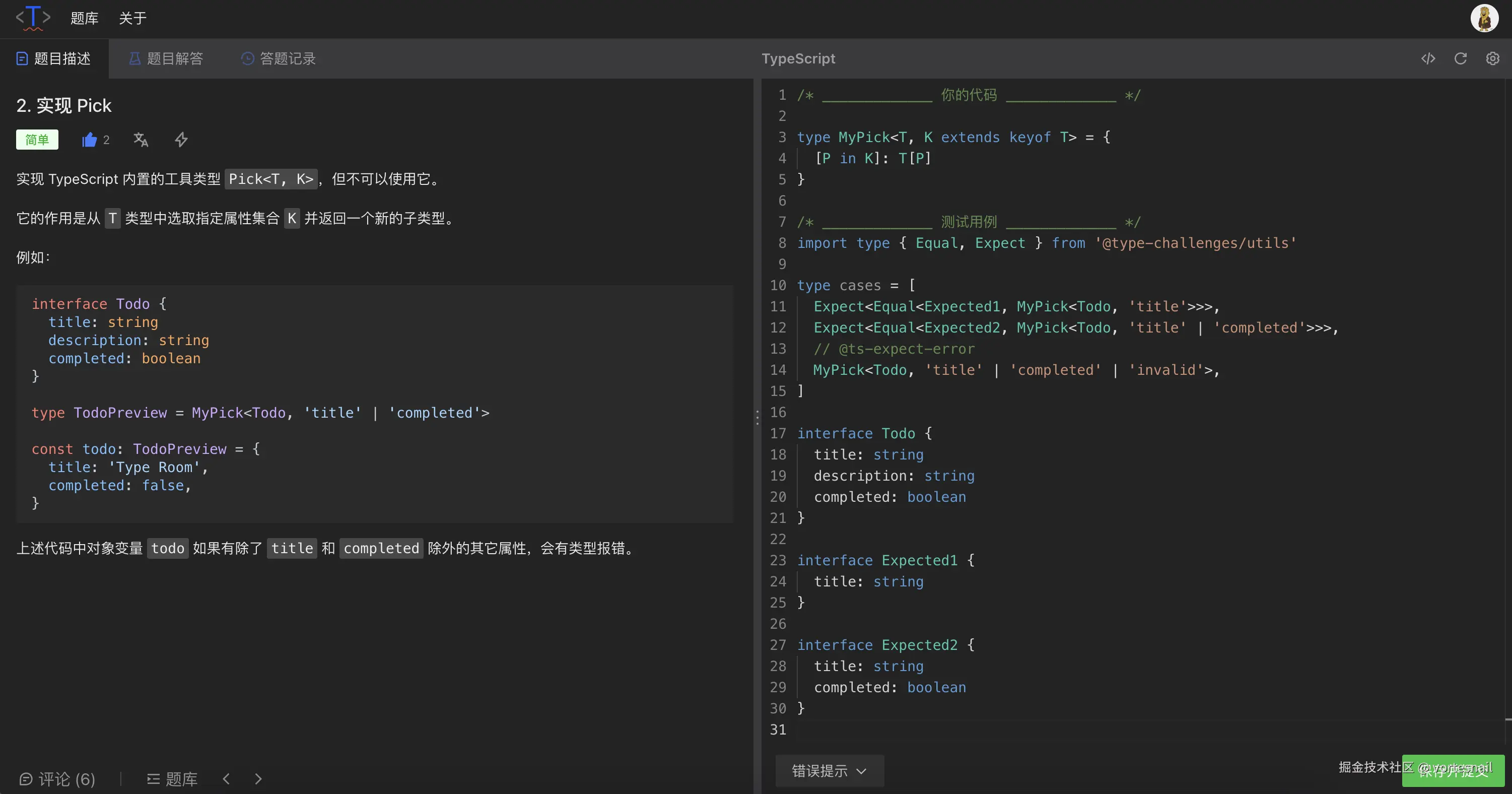 为了方便自己和广大前端开发者深入学习 TypeScript,我独立开发了一个小站 类型小屋 TypeRoom 用于方便地刷类型体操题目(题目目前基于 antfu 大佬的 type-challenges 这个开源项目)。