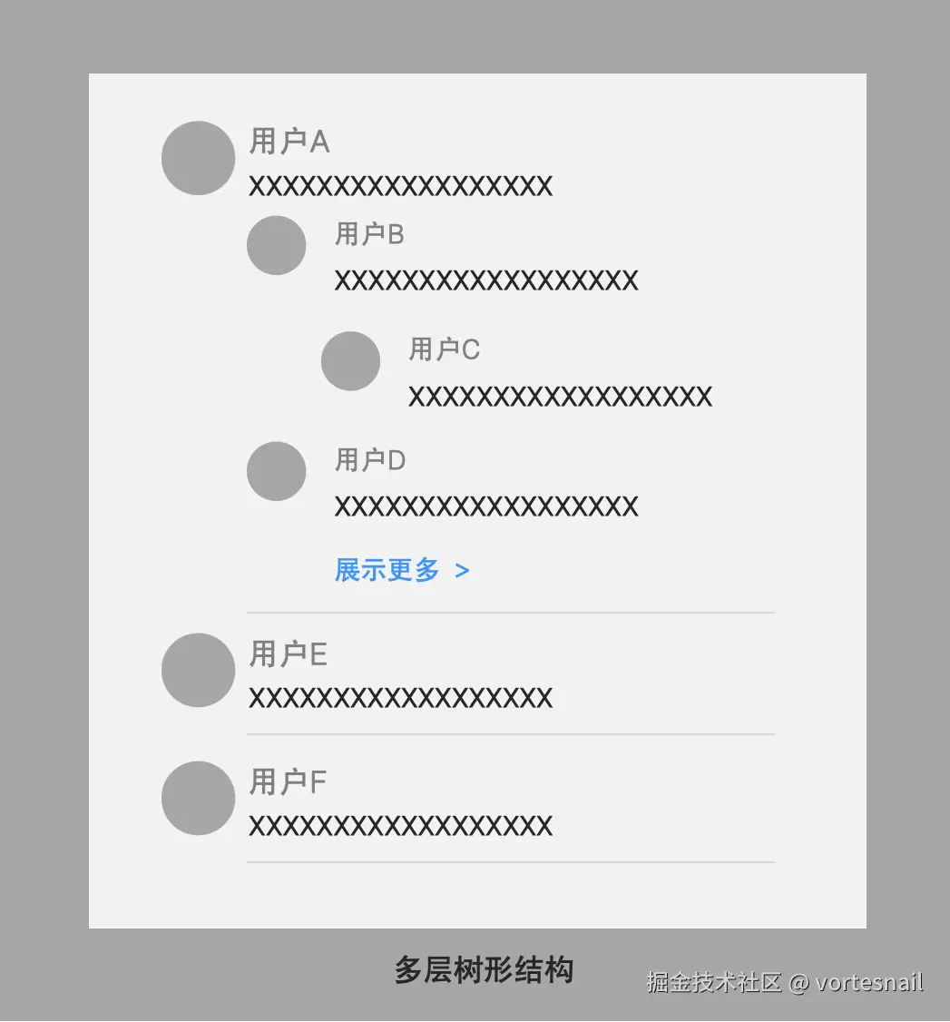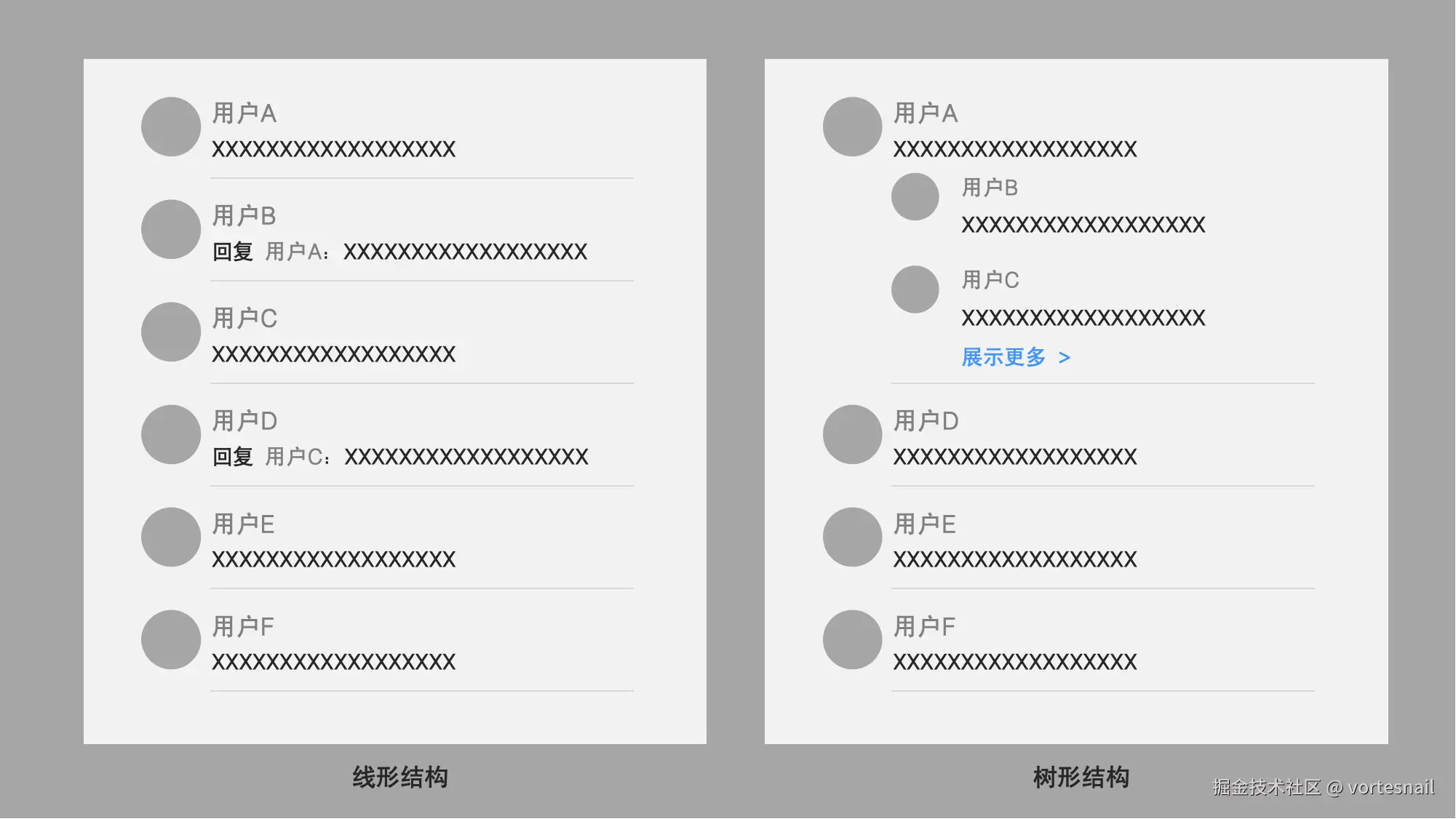所以可以看到现在大多数 APP、网站都是采用的顶层评论为树形结构,第二层回复为线形结构来展示评论的,它会聚合展示所有相关的回复,这样可以保证布局美观前提下还能看到清晰的对话记录。
