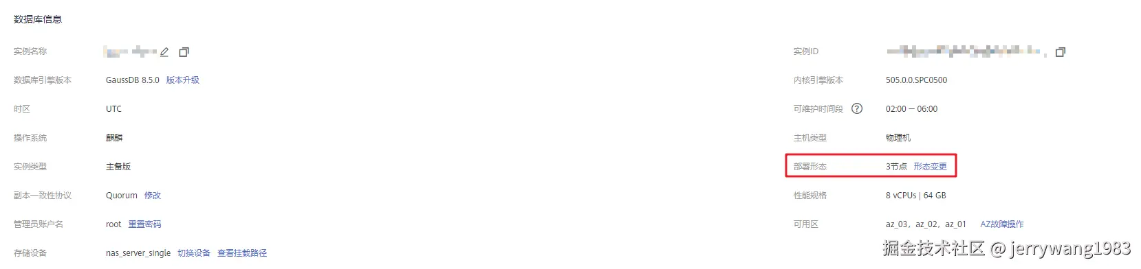 在实例基本信息页面的数据库信息模块,选择“部署形态”后的“形态变更”。
