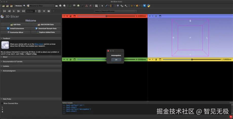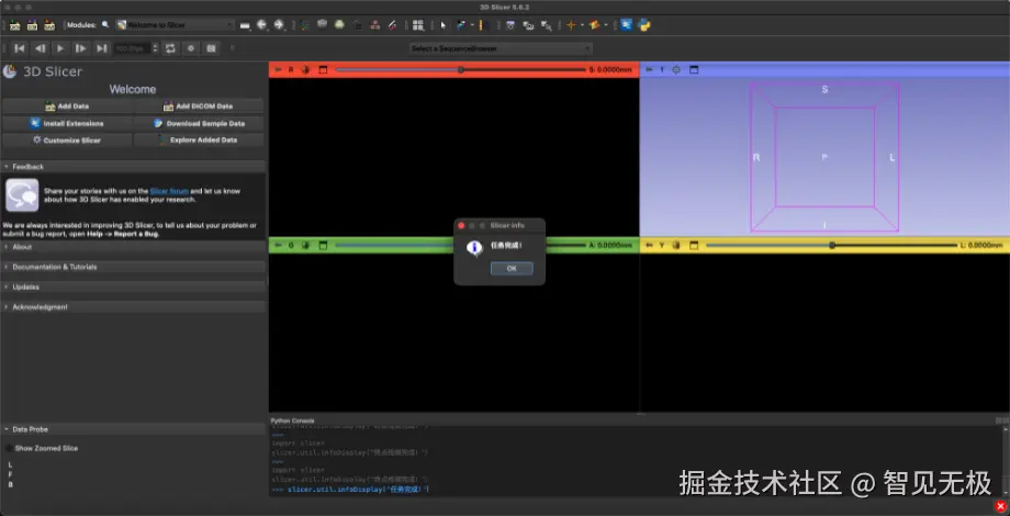 小编在做3d slicer(医学影像处理软件) 的自动化的时候,想在自动完成一个任务之后让软件跳出一个提醒,首先想到了Qt模块,可以在任务完成后弹出一个提示框,提示任务完成了。