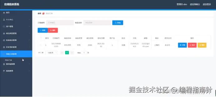 竞拍订单管理,在竞拍订单管理页面可以查看订单编号、商品名称;商品类型、成交价格、发布日期、用户名、姓名、手机、邮箱、地址、是否支付等内容,并可根据需要对竞拍订单管理进行详情,修改,删除或详细内容等操作,如图5-10所示。