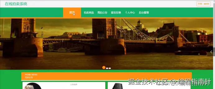 用户登录进入在线拍卖系统可以首页、拍卖商品、竞拍公告、留言反馈、个人中心、后台管理等内容,如图5-16所示。