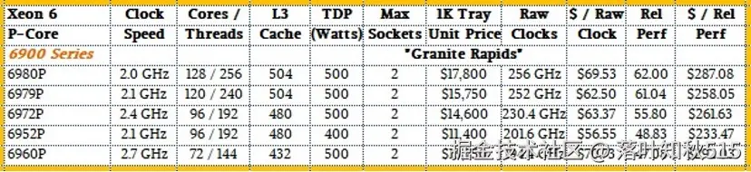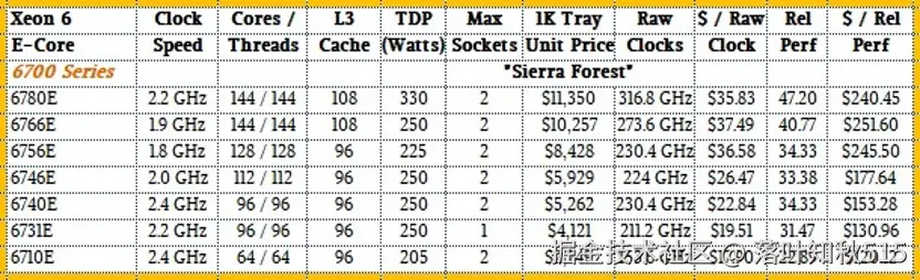 至强6最高频率SKU没有迈过4GHz的门槛,6900P最高统一都是3.9GHz,6700E系列更是只有3.2GHz。