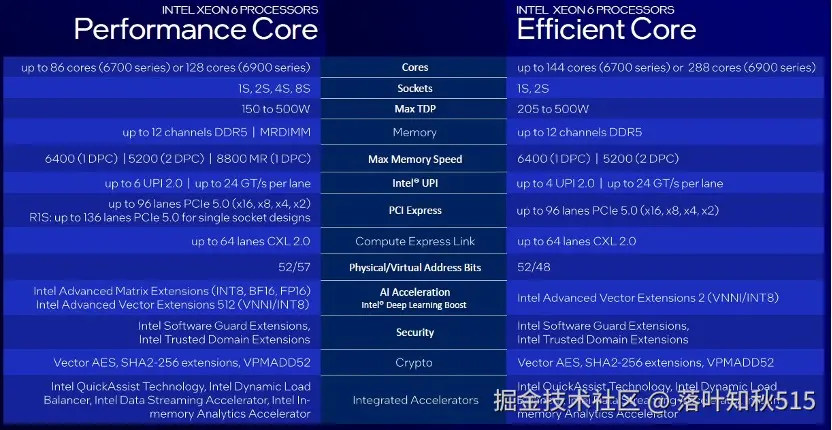性能核的单核性能高,拥有比其他通用 CPU 更好的 AI 性能,内存吞吐量高。每路多达128个内核,三级缓存高达504 MB,能够以较低的时延从三级缓存访问大量数据。