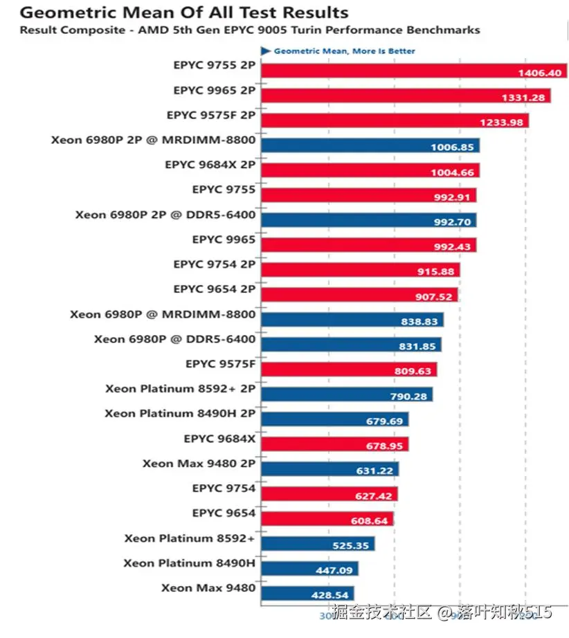 对比两者的旗舰SKU产品,EPYC 9755面对MRDIMM-8000高频内存加持的至强6980P,双路、单路优势分别高达40.0%、18.4%,如果将后者换成普通的DDR5-6400,领先幅度更是能进一步提升到41.7%、19.3%。