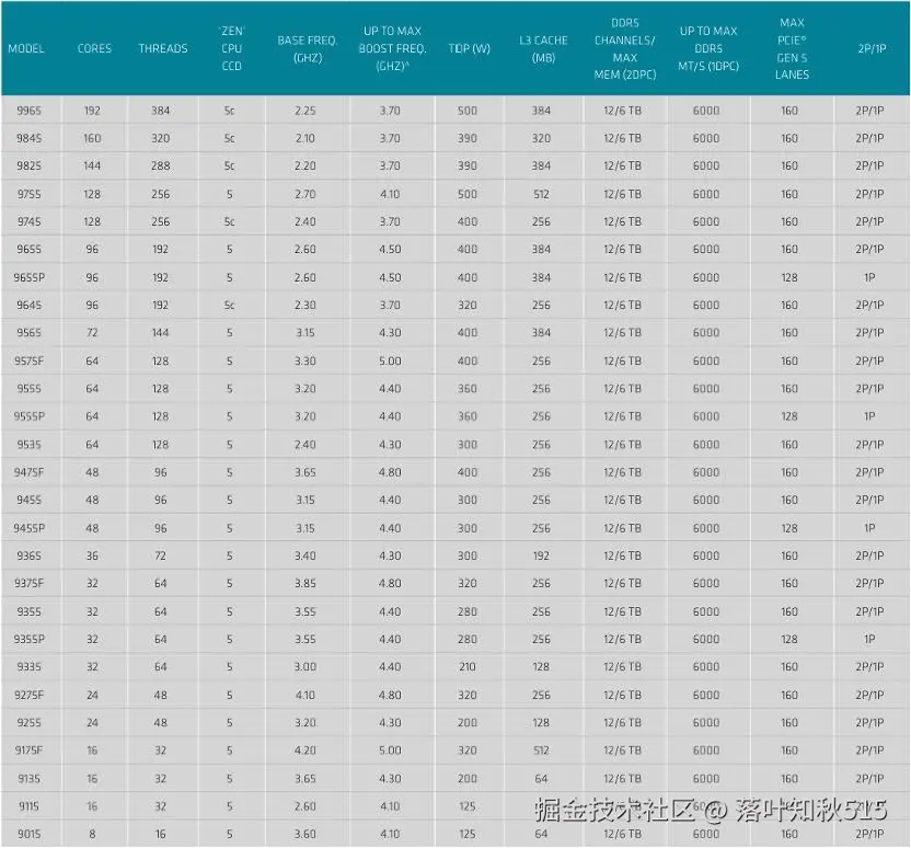 EPYC 9005全系列共有27款SKU,名称中的“5”代表的是Zen5架构,并且有两个版本可供选择:22款具有Zen5经典核心的128核版本和5款具有更密集的Zen5c的192核版本。