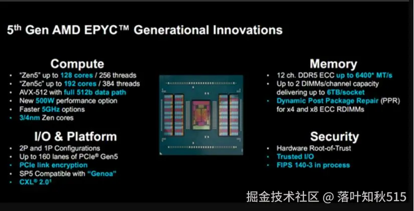 另外,核心数量大增的同时,EPYC 9005系列的最高睿频首次做到了5GHz,相比于四代EPYC的最高值增加了足足900MHz。当然,在功耗方面不可避免地增加了,最高可以达到500W。