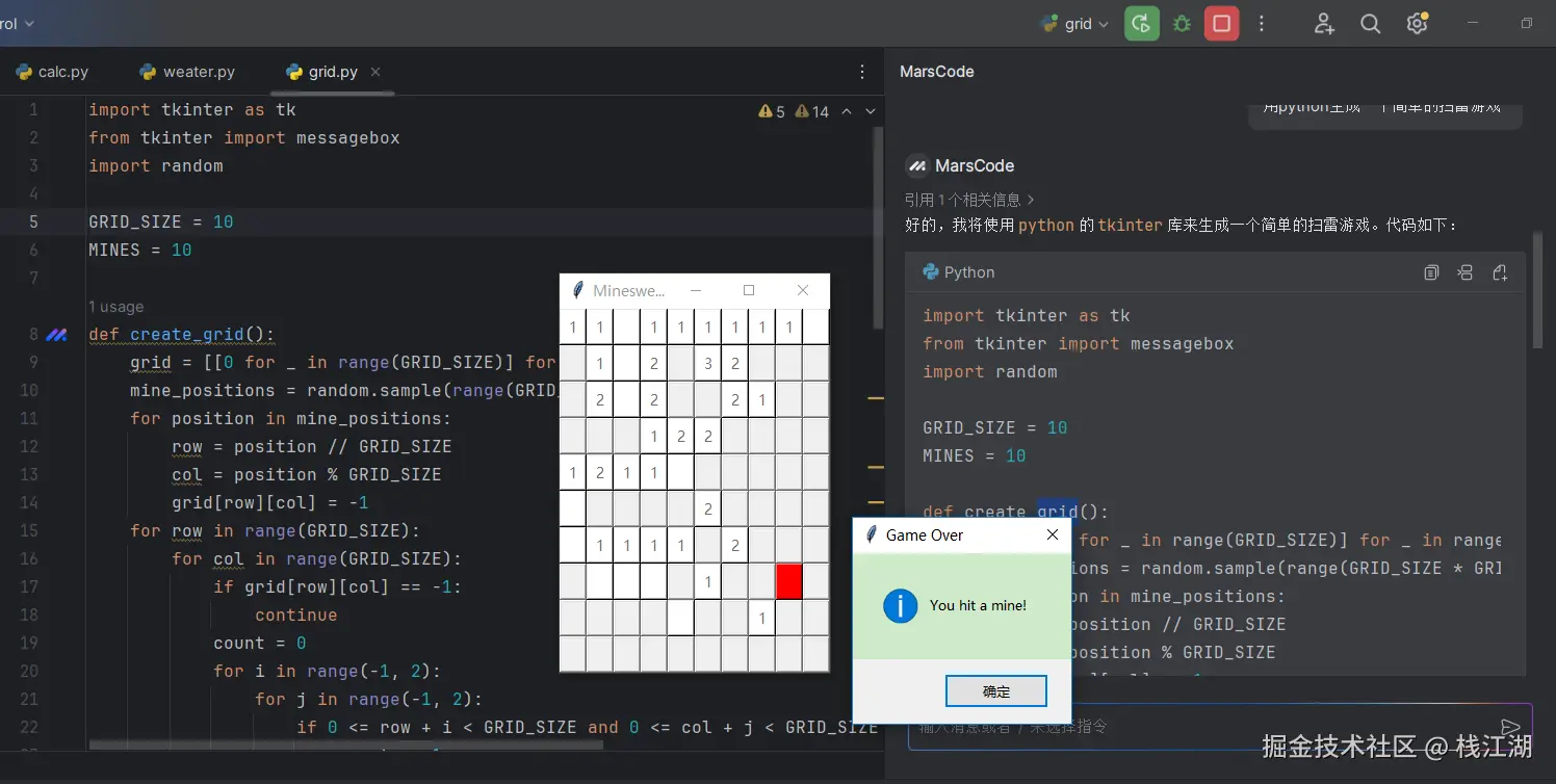 大概的要求是需要一个10x10的网格,随机设置10个地雷,并计算每个单元格周围的地雷数量。通过点击单元格来揭示它是否包含地雷,若获胜则显示消息,点到地雷则游戏失败重启。
