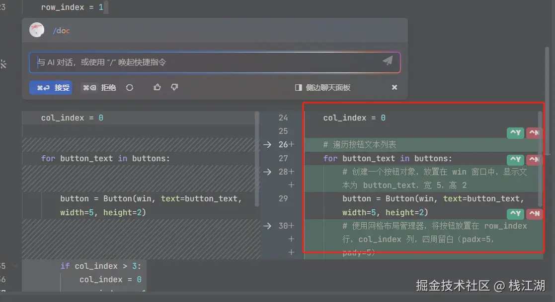 选中代码片段后,向豆包 MarsCode 编程助手发送代码注释生成指令。选中代码后会出现如下图的功能菜单