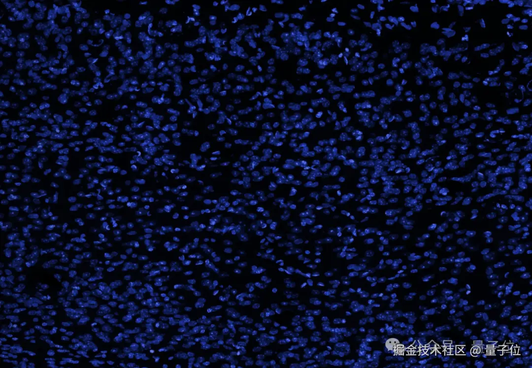 研究团队展示了一张大脑的横截面图像(蓝色表示细胞核),并表示人脑中看似空旷的空间实际上充满了轴突、树突和支持细胞,形成了密集的突触网络。