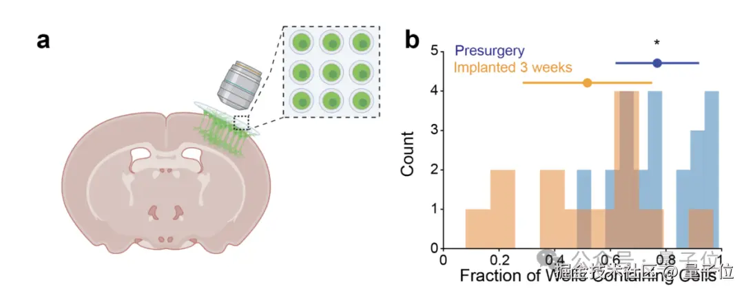 结果发现约 52% 的微孔中含有表达荧光蛋白的神经元,这些神经元向皮层内投射复杂突起,表现出自发的钙活动,组织学证实移植神经元与宿主脑紧密耦合。