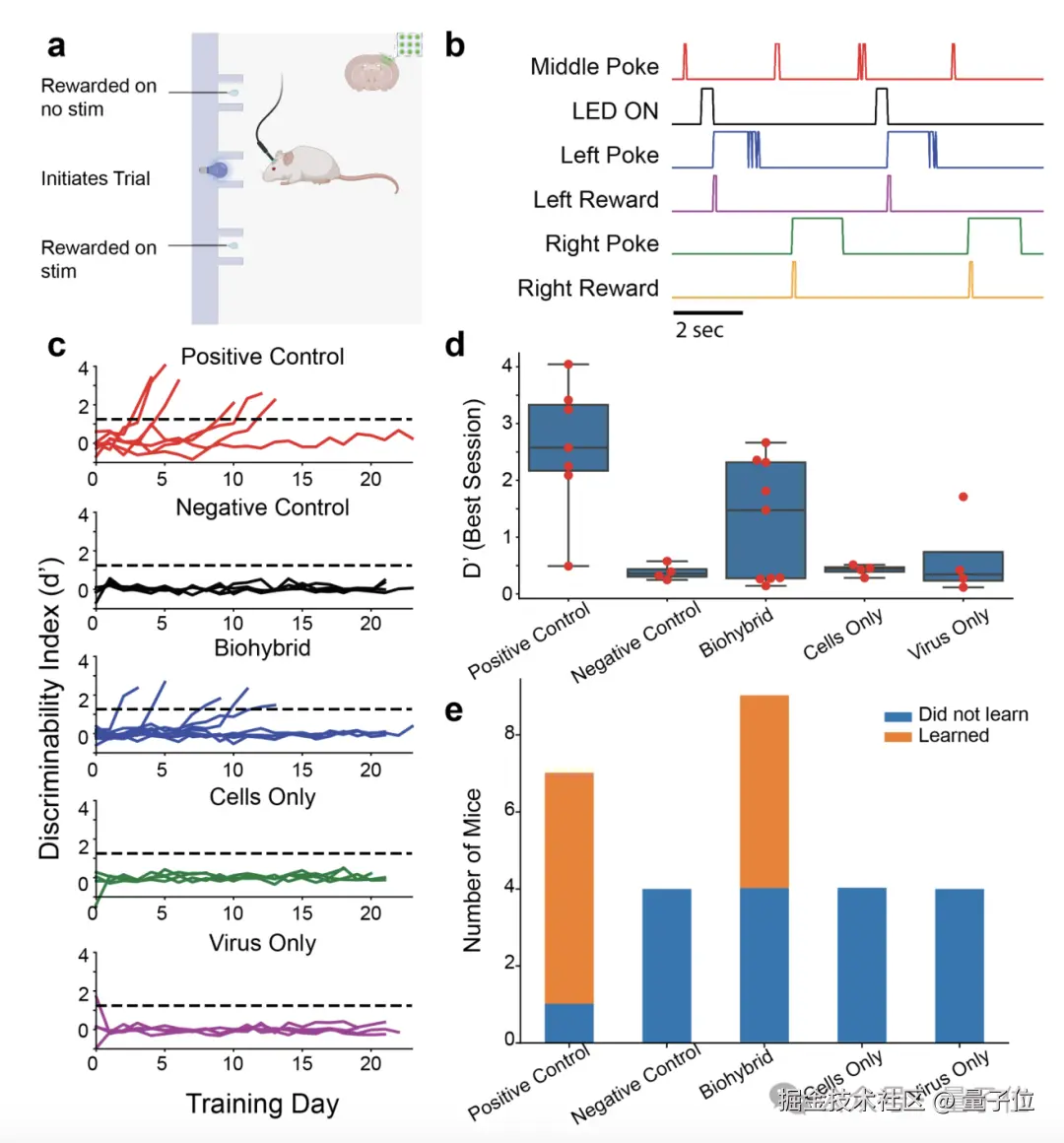 结果在光遗传刺激任务中,9 只接受移植的小鼠中有 5 只在 3 周内达到标准,与阳性对照组小鼠的学习曲线和所需训练天数无显著差异。