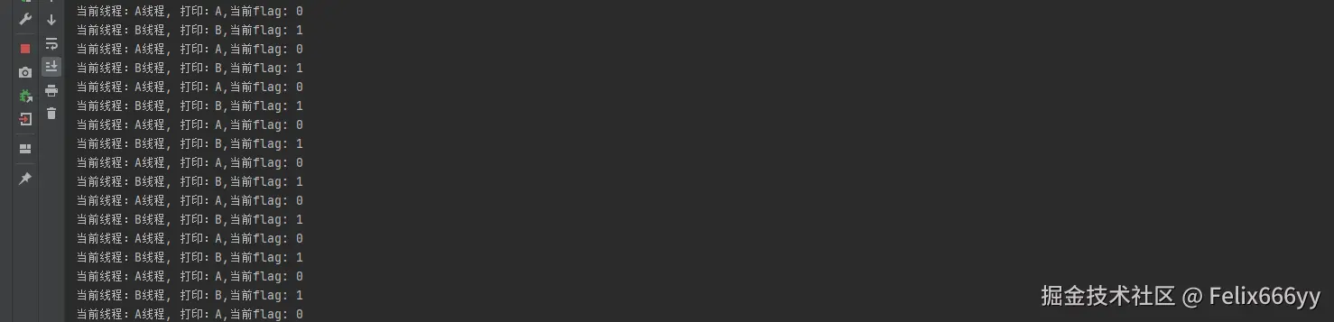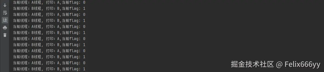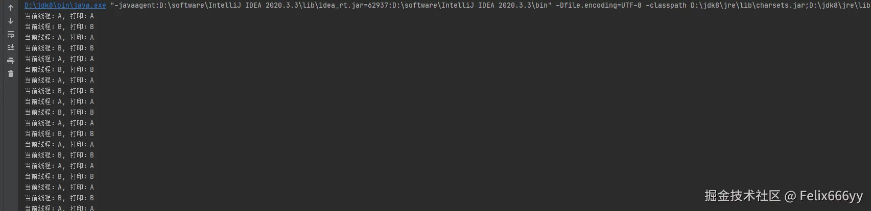System.out.println(String.format("当前线程:%s, 打印:A,当前flag: %s",Thread.currentThread().getName(), flag));