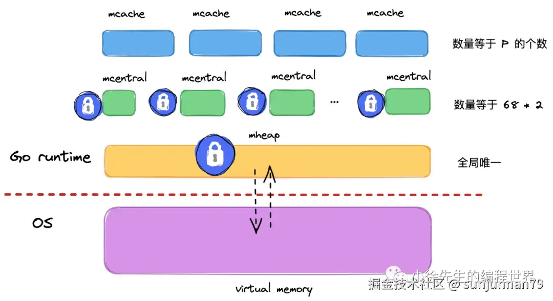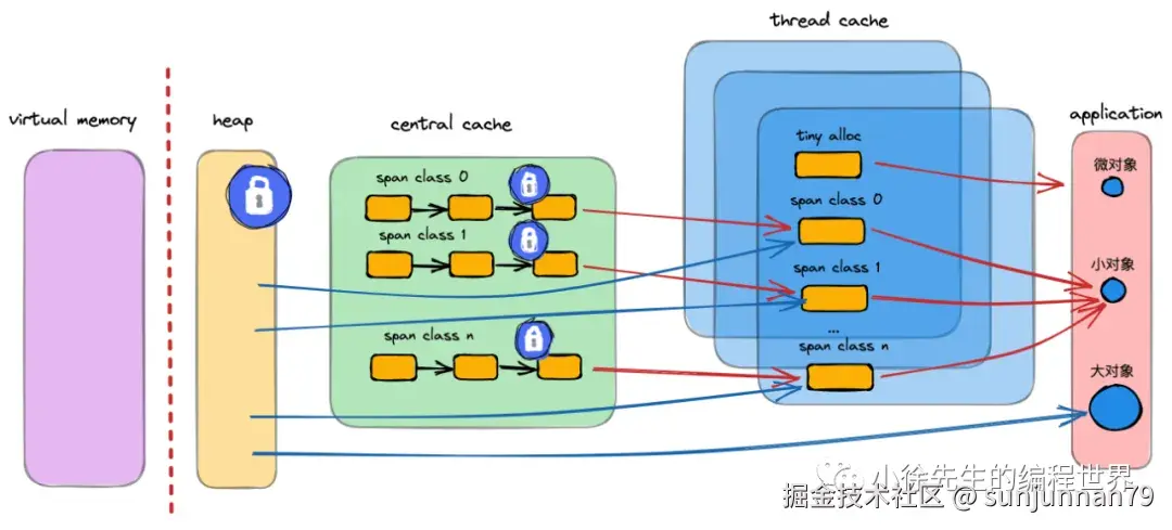 在解决这个问题,Golang 在堆 mheap 之上,依次细化粒度,建立了 mcentral、mcache 的模型,下面对三者作个梳理: