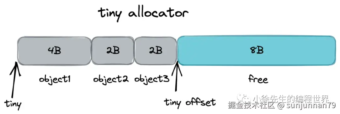 以 class 3 的 mspan 为例,class 分配的 object 大小统一为 24B,由于 object 大小 <= 16B 的会被分配到 class 2 及之前的 class 中,因此只有 17B-24B 大小的 object 会被分配到 class 3.