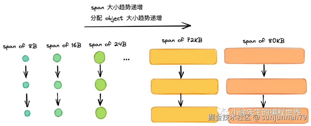 - 每个 mspan 根据空间大小以及面向分配对象的大小,会被划分为不同的等级(2.2小节展开)