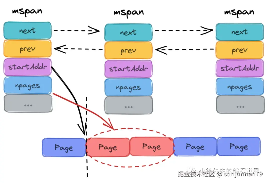 - mspan 大小是 page 的整数倍(Go 中的 page 大小为 8KB),且内部的页是连续的(至少在虚拟内存的视角中是这样)