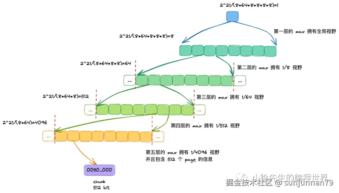 前文 Golang 内存模型与分配机制中,我们有介绍过,在 Golang 堆中会基于基数树的形式建立空闲页的索引,且基数树每个叶子节点对应了一个 chunk 块大小的内存(512 * 8KB = 4MB).