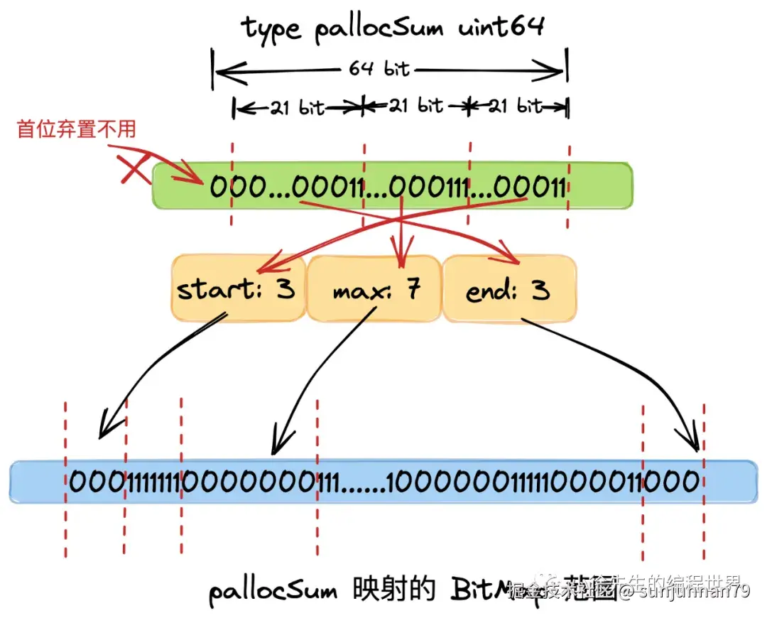 其中chunk的封装类 pallocData 中有还两个核心字段,一个 pallocBits 中标识了一个页是否被占用了(1 占用、0空闲),同时还有另一个 scavenged bitmap 用于表示一个页是否已经被操作系统回收了(1 已回收、0 未回收). 因此,回收协程的目标就是找到某个页,当其 pallocBits 和 scavenged 中的 bit 都为 0 时,代表其可以回收.