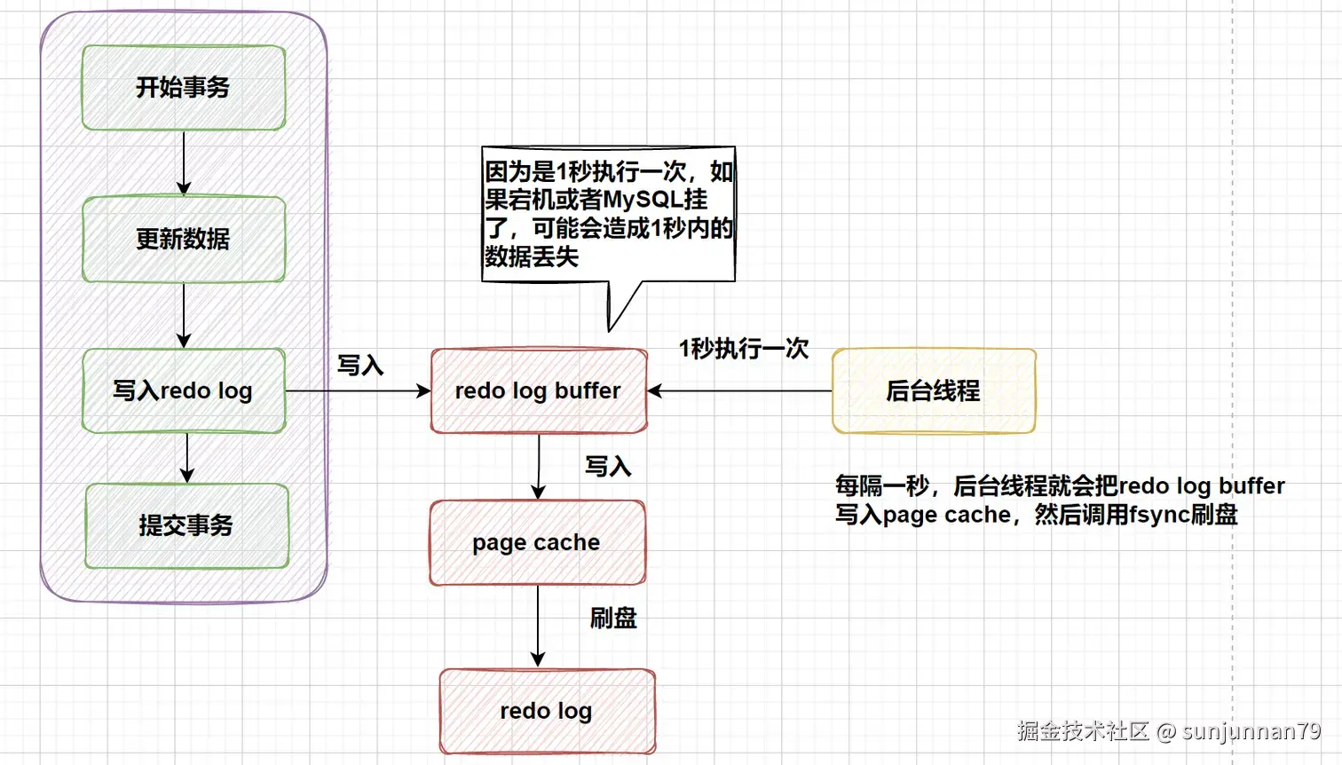 如上图,当事务提交成功时,redo log buffer 日志会被写入 page cache,然后后台线程会刷盘写入 redo log,由于后台线程是1秒执行一次所以宕机或者 MySQL 挂了可能造成1秒内的数据丢失。