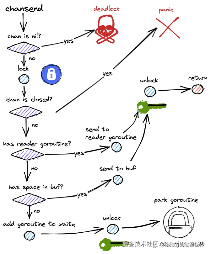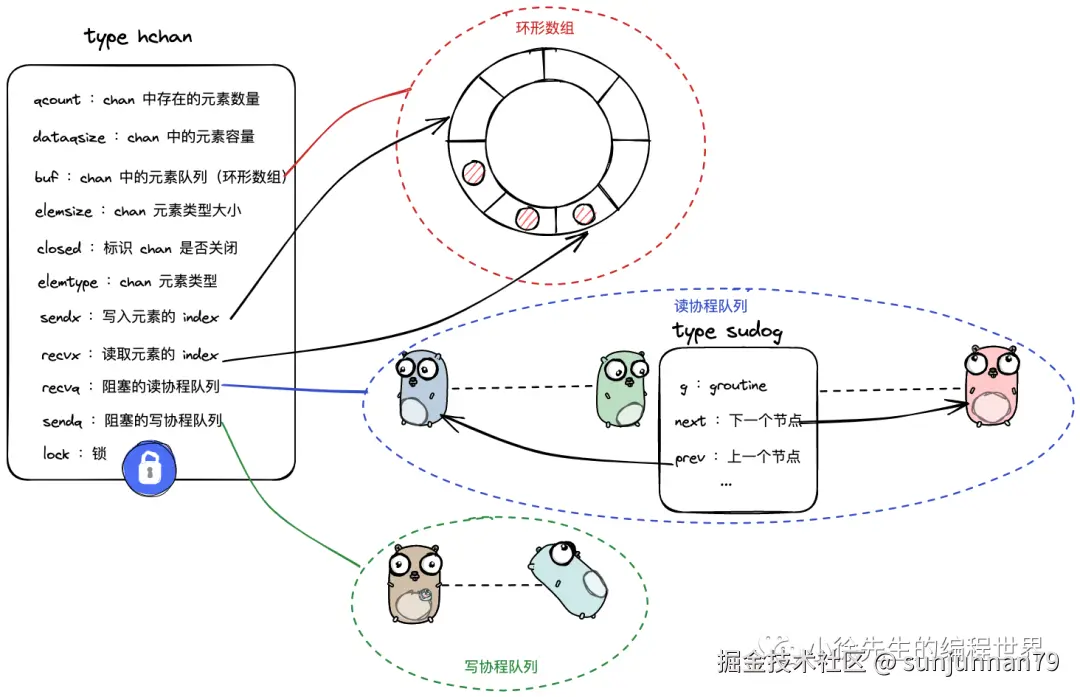 • 倘若协程从 park 中被唤醒,则回收 sudog(sudog能被唤醒,其对应的元素必然已经被读协程取走);