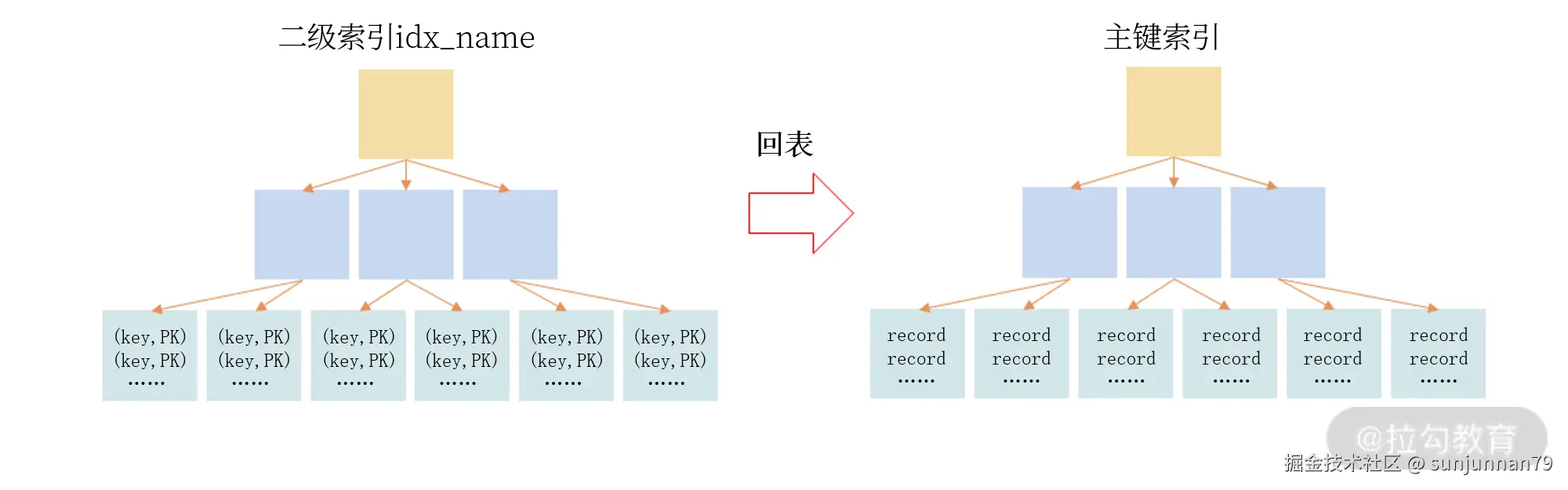 在InnoDB中除了主键索引之外,都称为二级索引或者非聚簇索引,在查询的时候,就是先通过二级索引查到对应的主键,再通过主键查询来找到对应的数据,这种操作成为“回表”