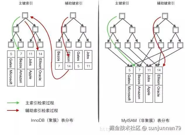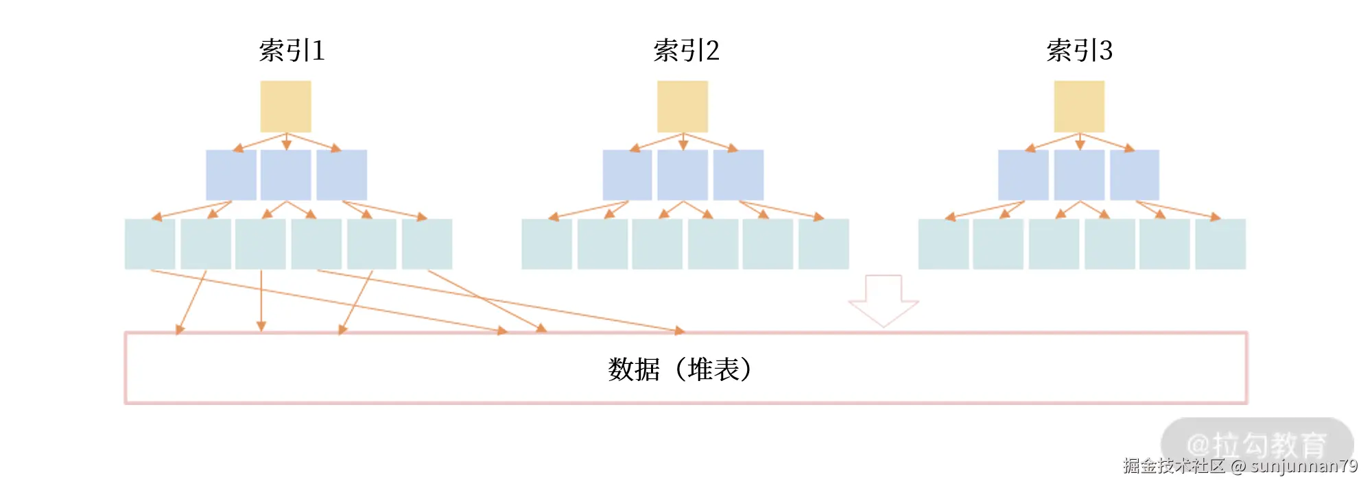 MyISAM存储引擎中,索引和数据是分开存储的,数据是无序排放的,这种无序的排放的结构就是堆表结构。在MyISAM中的索引都是非聚簇索引。